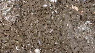 Tidal mudflat in Bulacan (Left) and sample of high-density mollusc bivalves in mudflats (right) Photo: Arne Jensen