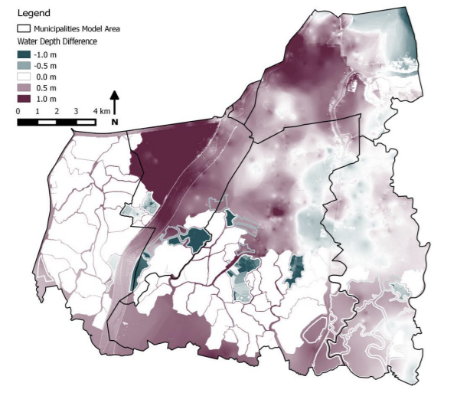 A thesis study by ‘t Veldt [21] shows that the presence of the fishponds on the historic tidal planes causes flooding upstream. This is best illustrated by the figures below, which shows numerical flood modelling results for 50-year subsidence/flooding scenarios. It was assumed that the fishponds will remain operational and “diked” for one scenario. It was assumed that the fishponds would be abandoned over time for the second scenario.